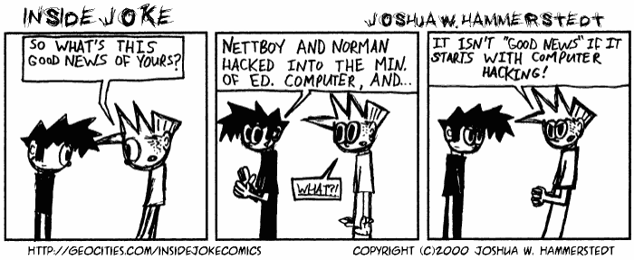 Inside Joke was my poorly-named and poorly-executed first attempt at a comic strip, which I started publishing on the internet long before it was ready. I jumped from Tripod to Geocities, and was never never happy with either free host. Then Keenspace came along, and Inside Joke moved there.