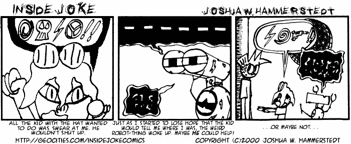 Inside Joke was my poorly-named and poorly-executed first attempt at a comic strip, which I started publishing on the internet long before it was ready. I jumped from Tripod to Geocities, and was never never happy with either free host. Then Keenspace came along, and Inside Joke moved there.