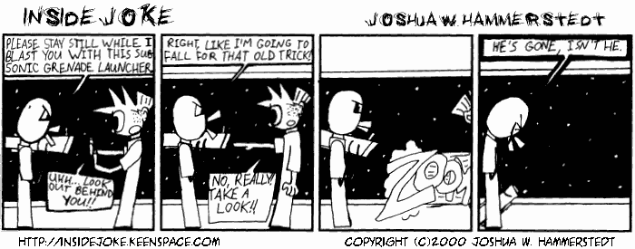 Inside Joke was my poorly-named and poorly-executed first attempt at a comic strip, which I started publishing on the internet long before it was ready. I jumped from Tripod to Geocities, and was never never happy with either free host. Then Keenspace came along, and Inside Joke moved there.