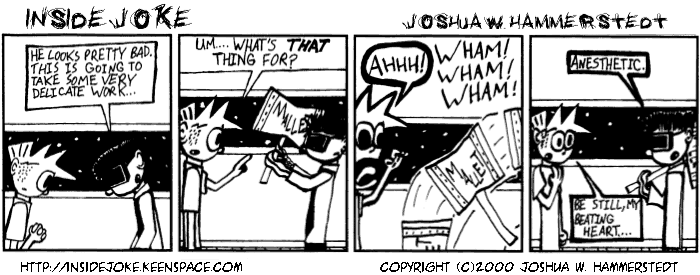 Inside Joke was my poorly-named and poorly-executed first attempt at a comic strip, which I started publishing on the internet long before it was ready. I jumped from Tripod to Geocities, and was never never happy with either free host. Then Keenspace came along, and Inside Joke moved there.