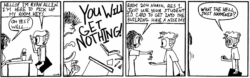 Inside Joke was my poorly-named and poorly-executed first attempt at a comic strip, which I started publishing on the internet long before it was ready. I jumped from Tripod to Geocities, and was never never happy with either free host. Then Keenspace came along, and Inside Joke moved there.