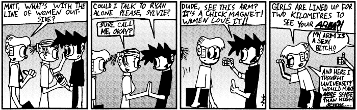 Most importantly, I can't honestly say all of this is good. Such is the catch 22 of webcomics — the pool may be a hundred kilometres wide, but it's only a few millimetres deep. It was a wonderful learning experience, especially in the early-ish days before webcomics really took hold, and I hope you had as much fun back then as I did. After all, it's a good thing it was fun then, because these strips sure are embarassing to look back on now.