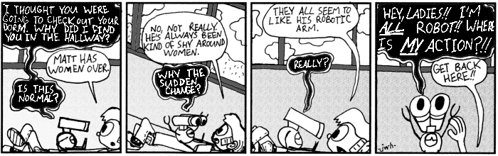 Because it's all a part of my development as a cartoonist (a process that never ends, I might add), I'm putting the entire run of Inside Joke / Inside Joke University (or at least all the strips I still have digital copies of) here, back on the free website where I spent most of my early cartooning years. The site is even a modified version of the final iteration of my old Keenspace site, because nostalgia is awesome. I apologize for any gaps in the archive (especially near the end), but this is a pretty good representation of my work throughout university, and a little bit after.