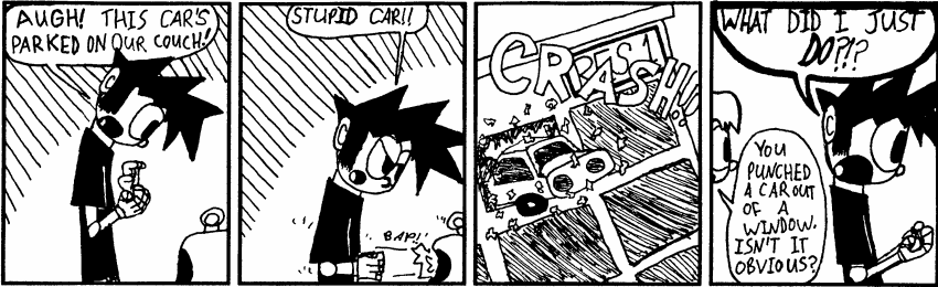 Most importantly, I can't honestly say all of this is good. Such is the catch 22 of webcomics — the pool may be a hundred kilometres wide, but it's only a few millimetres deep. It was a wonderful learning experience, especially in the early-ish days before webcomics really took hold, and I hope you had as much fun back then as I did. After all, it's a good thing it was fun then, because these strips sure are embarassing to look back on now.