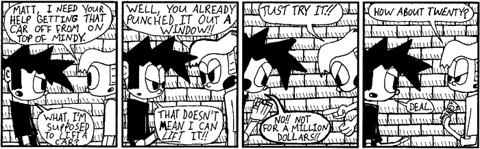 Most importantly, I can't honestly say all of this is good. Such is the catch 22 of webcomics — the pool may be a hundred kilometres wide, but it's only a few millimetres deep. It was a wonderful learning experience, especially in the early-ish days before webcomics really took hold, and I hope you had as much fun back then as I did. After all, it's a good thing it was fun then, because these strips sure are embarassing to look back on now.