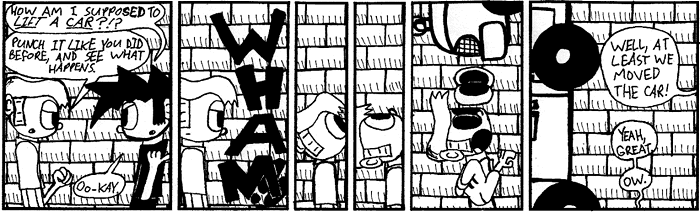 Most importantly, I can't honestly say all of this is good. Such is the catch 22 of webcomics — the pool may be a hundred kilometres wide, but it's only a few millimetres deep. It was a wonderful learning experience, especially in the early-ish days before webcomics really took hold, and I hope you had as much fun back then as I did. After all, it's a good thing it was fun then, because these strips sure are embarassing to look back on now.