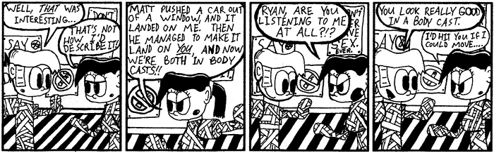Most importantly, I can't honestly say all of this is good. Such is the catch 22 of webcomics — the pool may be a hundred kilometres wide, but it's only a few millimetres deep. It was a wonderful learning experience, especially in the early-ish days before webcomics really took hold, and I hope you had as much fun back then as I did. After all, it's a good thing it was fun then, because these strips sure are embarassing to look back on now.