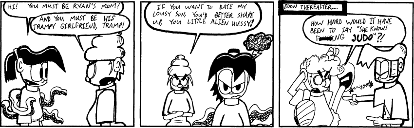 Most importantly, I can't honestly say all of this is good. Such is the catch 22 of webcomics — the pool may be a hundred kilometres wide, but it's only a few millimetres deep. It was a wonderful learning experience, especially in the early-ish days before webcomics really took hold, and I hope you had as much fun back then as I did. After all, it's a good thing it was fun then, because these strips sure are embarassing to look back on now.